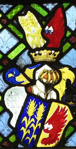 Das Wappen ist gespalten. Es zeigt vorn in blauem Feld auf grünem Grund zwei üppige Kornpflanzen mit zwei Ähren in ihrer natürlichen Gestalt, hinten in goldenem Feld ein roter geschlossener rechtsgekehrter Adlerflug, jede Sachse mit einer von Silber und Blau geteilten Raute belegt. Auf dem gekrönten Helm die Kornähren und der Flug wie im Schild. Die Helmdecken sind rechts blau silbern, links gold und rot.[3]