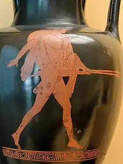 Der Sklave, der den Knaben auf dem Schulweg begleitete und für das richtige Benehmen Anweisungen gab, war der paidagogos. Sklaven zählten nicht als Person, sondern als Sache. Da die Sklaven eine Kapitalanlage waren, deren Arbeitskraft ausgenutzt werden musste, wurden häufig nur solche Sklaven verwendet, die zu anderer Arbeit nicht taugten.[5] Wegen der in Athen herrschenden Knabenliebe musste der paidagogos aufpassen, dass dem Knaben auf dem Schulweg nichts geschah.[6] Er trug ihm auch die nötigen Schulsachen.[7] Ganz reiche Eltern leisteten sich sogar den Luxus, die Schulsachen durch besondere Diener tragen zu lassen.[8] Der paidagogos wohnte dem Unterricht bei und betreute die Schulaufgaben der Knaben. Ansonsten verbot das Gesetz[9] bei Todesstrafe anderen Erwachsenen als den nächsten Angehörigen das Betreten der Schule während des Unterrichts. Der paidagogos brachte seinem Schützling ebenfalls äußeren Anstand bei, nämlich zum Beispiel