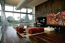 Der Palast hat einen rechteckigen Wasserspiegel der das Gebäude reflektiert und so für den Gast einen scheinbar unendlichen virtuellen Raum schafft, ergänzt von einer Bronze-Skulpturengruppe, genannt As Banhistas („Die Badenden“), geschaffen von dem brasilianischen Bildhauer Alfredo Ceschiatti.[4]