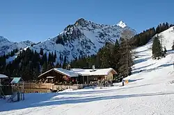 Zwischen der Bergstation Palüdbahn und der Talstation Glattjochbahn liegt der Alpengasthof Melkboden vor der 2331 m hohen Windeggerspitze im Rätikon.