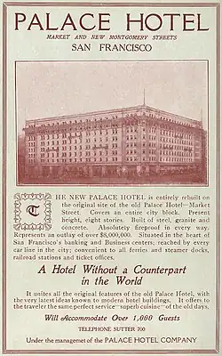 Palace Hotel heißt ein 1909 errichtetes historisches Luxushotel in San Francisco, Kalifornien an der südwestlichen Ecke von Market Street und New Montgomery Street. Es wird auch als "New" Palace Hotel bezeichnet, weil es das ursprüngliche, 1875 errichtete und im Erdbeben von 1906 zerstörte Hotel gleichen Namens ersetzte.