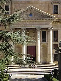 Eine breite Treppe führt zum Eingang, der mit vier Säulen und einem Giebel versehen ist. Der Patio ist im neoklassizistischen Stil mit Rundsäulen und offener Galerie gestaltet.