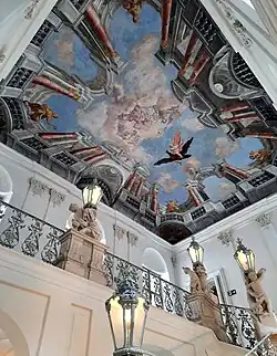 Eine Besonderheit des Palais Herberstein ist das von Josef Hueber von 1754 bis 1757 errichtete Treppenhaus im Mittelflügel. Es ist von beiden Höfen aus zugänglich. Die Prunkstiege zählt zu den schönsten barocken Anlagen der Steiermark. Neben einem Rokoko-Schmiedeeisengitter ist sie mit Sandstein-Puttenpaaren ausgestattet, die als Laternenträger dienen. Die Figuren gestaltete der Südtiroler Künstler Veit Königer. Sämtliche Deckenfresken mit Darstellungen der Aufnahme Ganymeds in den Olymp und den vier Jahreszeiten (1756) werden dem Maler Philipp Carl Laubmann zugeschrieben. Im zweiten Obergeschoß schließt an das Treppenhaus ein ovaler Raum, ebenfalls mit einem Deckenfresko von Laubmann, an.