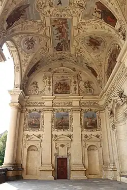 Die Loggia des Palais wurde nach Vorbildern ligurischer Architektur gestaltet und weist Ähnlichkeiten mit der Loggia des Domes von Livorno von Alessandro Pieroni auf. Die Innenräume der Loggia sind mit reichen Stuckdekorationen von Baccio del Bianco geschmückt. Die Wandgemälde zeigen unter anderem Motive aus der Äneis und olympische Götter, bei denen Neptun und Mars hervorgehoben werden und sind von Kartuschen aus Stuck umrahmt, die neben Festons und Rollwerk auch mit Kriegstrophäen verziert sind. Sie verherrlichen – ähnlich wie im Festsaal des Palais – Wallenstein als Feldherrn, indem sie an dessen kriegerische Erfolge erinnern. Außerdem verdeutlichen sie auch dessen Bestrebungen, im Norden eine große Seemacht zu schaffen. Im Jahr 1853 wurden die Gemälde übermalt und 1954 wieder restauriert.