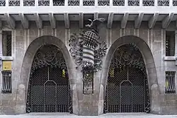 Vorne zwischen den Pforten befindet sich ein schmiedeeisernes Werk, das die katalanische Flagge darstellt. Darüber befindet sich der Phönix als Zeichen der Renaixença sowie als Wächter des Eingangs. Beides zeigt, dass sowohl der Auftraggeber wie auch der Architekt sehr patriotisch waren. Auf den Toren stehen die Initialen E und G für Eusebi Güell.