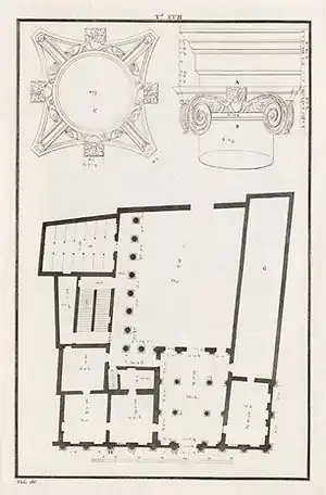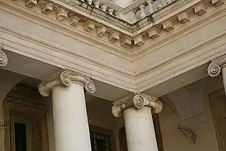 Die zweigeteilten Fassade besteht aus übereinandergestellten Halbsäulen ionischer und korinthischer Ordnung. Im Mezzaningeschoss befinden sich in nur sechs Fensterachsen Reliefs, da der Palast im sechzehnten Jahrhundert um zwei Fensterachsen nach links erweitert wurde.