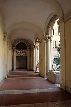 Der Beitrag Borrominis kann dem Portikus, dem Innenhof und vor allem dem inneren Eingangsportal zugeschrieben werden; letzteres ist zweifellos eines der charakteristischsten Elemente der gesamten Anlage. Obwohl es sich im Inneren des Palastes befindet, scheint sein Bild nach außen projiziert zu werden, insbesondere auf den Platz. An der Spitze des Portals befindet sich das Gesicht der Medusa zwischen zwei Flügeln und einer Muschel. Von hier aus gehen seitlich zwei spiralförmige Füllhörner ab, die sich über die Kapitelle der beiden Säulen, die das Portal tragen, zu ergießen scheinen. In dem Raum zwischen den Füllhörnern und den Kapitellen befinden sich eine Fülle von Feldfrüchten, ein Kind und ein Krug, die alle Glück und Fruchtbarkeit symbolisieren sollen. Von den Kapitellen selbst hängt eine mit Blumen und Lorbeerblättern geschmückte Girlande herab, die unten eine Art Oval abgrenzt, das am oberen Ende durch einen Bogen dargestellt ist.[8]