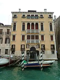 Der vierstöckige Renaissancepalast mit einer sehr ausgeglichenen und harmonisch eingeteilten Fassade zeigt in der Mitte des Erdgeschosses ein Rundbogenportal zum Wasser und ein Dreifach-Rundbogenfenster mit vorspringendem Balkon im zweiten Hauptgeschoss, flankiert von zwei Paaren einzelner Rundbogenfenster, wogegen alle anderen Fensteröffnungen, wie das Dreifachfenster mit Balkon in der Mitte des ersten Hauptgeschosses, die beiden flankierenden Einzelfenster dort, die entsprechenden Fenster des Zwischengeschosses unter dem Dach, sowie die je sechs Fenster im Erd- und Zwischengeschoss rechteckig sind. Die ab dem ersten Zwischengeschoss verputzte und gelb gestrichene Fassade schließt nach oben mit einer gezahnten Dachtraufe ab. Auf dem Dach befindet sich eine Dachgaube mit rechteckigem Vierfachfenster.