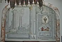 Die Quadraturen von Pintucci stellen antike Landschaften dar, die durch architektonische Elemente verdeckt und teilweise von wilder Vegetation bedeckt sind. In der Mitte der Galerie sind auf einer großen Tafel heidnische Götter in einer bukolischen Komposition dargestellt. Das Gewölbe wird von Putten belebt, die karmesinrote Seidenbänder und Blumengirlanden schwingen und von einem Schwarm fantastischer Vögel umgeben sind.