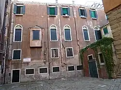 - links liegen das Portal zum Wasser, die Mündung der ‚‘Calle del Traghetto zum Canal Grande und ein venezianisches Fenster mit Balkon, flankiert von drei Einzelfenstern auf der Ebene des Hauptgeschosses.
