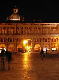 Der Palast wurde 1412 aufgebaut, aber die Ergänzungen der Fassade und der Arkade stammen aus den Jahren 1565 bis 1568 und wurden vom zu jener Zeit berühmten Architekten Jacopo Barozzi[3], ansonsten als Vignola bekannt, durchgeführt. Von hier aus erstreckt sich der bekannteste Bogengang, der Pavaglione, der die Piazza Maggiore mit dem Palazzo dell’Archiginnasio, dem ältesten Sitz der Universität Bologna, verbindet.