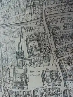Das Gebiet, auf dem heute der Palazzo delle Poste steht, auf einem Ausschnitt eines bekannten Stiches von Andrea Bolzoni aus dem Jahre 1747. Das betroffene Gebiet liegt an der Kreuzung des Canale Panfilio (heute Viale Cavour) und der Via San Domenica (heute Via degli Spadari). Auf dem Bild sieht man im Detail die Kirche und das Kloster San Domenico und daran anschließend das Inquisitionsgericht.