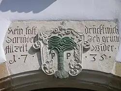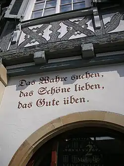 Am linken Rand der westlichen Seite, über dem Eingang der heute unter anderem zu den Arztpraxen führt, steht der Spruch:
