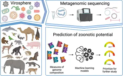 In einer Studie aus dem Jahr 2012 wird behauptet, dass „mathematische Modellierung, Diagnostik-, Kommunikations- und Informationstechnologien bis dato unbekannte Mikroben und andere Spezies identifizieren und melden können“ und „daher neue Risikoevaluierungsansätze benötigt werden, um die Mikroben, die mit höchster Wahrscheinlichkeit menschliche Krankheiten hervorrufen, zu identifizieren“. Die Studie untersucht Herausforderungen, die globale Strategie zum Umgang mit Pandemien von Reaktion auf Prävention umzuwandeln.[11] Einige Wissenschaftler untersuchten Blutproben von Wildtieren auf neue Viren.[12] In dem internationalen Global Virome Project (GVP) versucht man die Ursachen von tödlichen neuen Krankheiten vor dem Übergang in den Menschen zu identifizieren. Dafür werden Viren, die in Wildtieren gefunden werden, genetisch charakterisiert.[13] Edward Rubin notes that after sufficient data has been gathered artificial intelligence could be used to identify common features and develop countermeasures and vaccines against whole categories of viruses.[13] Es könnte möglich sein, virale Evolution mit maschinellem Lernen vorauszusagen.[14] Finanzielle Mittel für das PREDICT-Forschungsprogramm der USA, in dem man versuchte, Tierpathogene, welche Menschen infizieren könnten, zu identifizieren und Pandemien zu verhindern, wurden 2019 gestrichen.[15] Im Jahr 2021 berichteten Pathogenforscher die Entwicklung von Modellen maschinellen Lernens für genomikbasierte Früherkennung und Priorisierung potenzieller zoonotischer Hochrisikoviren in Tieren. Damit könnten vor einem potenziellen Spillover auf den Menschen (u. a.) Maßnahmen der „Früherkennung und Ausbruchsvorbereitung“ eingesetzt werden. Laut der Studie wäre die Software in der Lage gewesen, SARS-CoV-2 als Hochrisikostamm ohne vorherige Kenntnis zoonotischer SARS-verwandter Coronaviren vorherzusagen.[16][17] Die finanziellen Mittel für Programme der CDC der USA, in denen Arbeiter geschult wurden, Ausbrüche zu erkennen und die labortechnischen und Notfallsreaktionssysteme in Ländern, in denen die Krankheitsrisiken am höchsten sind, zu verbessern, um Ausbrüche an der Quellen einzudämmen, wurden 2018 um 80 % gekürzt.[18]