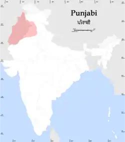 Panjabi wird in der zwischen Pakistan und Indien geteilten Region Punjab und in der weltweiten Diaspora gesprochen. Weltweit gibt es mindestens 115 Millionen muttersprachliche Sprecher des Panjabi. In Pakistan wird es laut vorab veröffentlichten Ergebnissen der Volkszählung 2017 von knapp 81 Millionen Menschen als Muttersprache gesprochen. Mit einem Anteil von 39 Prozent an der Gesamtbevölkerung ist das Panjabi die größte Einzelsprache Pakistans. In der bevölkerungsreichsten Provinz Punjab stellen Panjabi-Sprecher die Bevölkerungsmehrheit.[1] In Indien hat Panjabi laut der Volkszählung 2011 rund 33 Millionen muttersprachliche Sprecher. Die meisten Panjabi-Sprecher leben im Bundesstaat Punjab, wo sie die Bevölkerungsmehrheit stellen. Panjabisprachige Minderheiten gibt es auch in Haryana, Rajasthan und Delhi.[2] Migrationsbedingt gibt es eine große Panjabi sprechende Diaspora in Nordamerika, Europa und der Golfregion. Größere Zahlen von Panjabi-Sprechern leben unter anderem in Kanada (430.000),[3] dem Vereinigten Königreich (270.000 allein in England und Wales)[4] und den Vereinigten Staaten (250.000).[5]