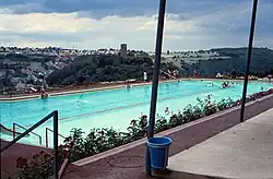 Durch die Zunahme des wirtschaftlichen Wohlstandes nach dem Ende des Zweiten Weltkrieges und die steigende Zahl von Urlaubsgästen entstand der Wunsch nach einem neuen Schwimmbad mit dem Komfort der damaligen Zeit. Daher kam eine Ertüchtigung des verfallenen Bades im Warmsrother Grund nicht mehr in Frage. Die Wahl des Grundstückes fiel auf ein Wiesengelände oberhalb der Stadt am südlichen Waldrand, sodass neben einer Fernsicht auch die volle Sonneneinstrahlung von morgens bis in die Dämmerung gewährleistet werden konnte.[10] Am 14. Dezember 1959 erfolgte der erste Spatenstich zur Erschließung des Geländes.[11] Nach Baukosten von 575.745 DM konnte das neu erbaute Höhenfreibad mit „hochmodernen hygienischen und schwimmsporttechnischen Errungenschaften“ am 14. Juli 1962 eingeweiht werden.[12] Die Anlage bestand aus einem Schwimmer- und Nichtwimmerbecken mit jeweils 50 Metern Länge, Sprungtürmen (1 und 3 Meter), Rutsche und Kinderbecken. Oberhalb der Liegewiesen befand sich auf einem aufgeschütteten Plateau eine Kleingaststätte mit Fernsicht. Umkleideräume, Büro, Kasse und sanitäre Anlagen waren in einem länglichen Flachbau, die technischen Betriebsräume im seitlich unterkellerten Schwimmbecken untergebracht. Das Schwimmbad wurde mit dem Petunia-Verfahren betrieben, nach welchem Flussgewässer genutzt und aufbereitet werden, um in verschiedenen Stufen, „Schwimmwasser“ herzustellen. Dazu nutzte man das ca. 27 °C warme Wasser des Warmen Brunnens im Tal unterhalb des Gollenfelsens in der Staatsstraße, an dem sich eigens für das Schwimmbad eine Pumpstation befand. Über eine ca. 500 m lange Leitung wurde das Wasser nach oben zum Bad gepumpt, um in den Schwimmbecken eine ausreichende und beständige Wassertemperatur halten zu können. Nach einigen Probejahren erwies sich diese Lösung als unzureichend, daher baute man 1969 eine elektrische Wasserbeheizungsanlage ein, die eine Dauertemperatur von 23 °C ermöglichte und war das erste beheizte Freibad im Kreis Bad Kreuznach.[13]