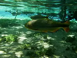 In den Flüssen, Lagunen und Überschwemmungsflächen des Pantanals lebt eine hohe Zahl an Fischarten, deren Lebenszyklus von den Regen- und Trockenzeiten bestimmt wird.[9][10][11][12][13] Zu den dominierenden Spezies gehören große Raubfische wie Dourados (Salminus maxillosus), Traíras, Tucunaré-Pfauenbarsche (Cichla temensis) und kleinere wie Pfauenaugenbuntbarsche (Astronotus ocellatus). In den seichteren und sandigen Bereichen gibt es Süßwasserrochenarten wie z. B. Potamotrygon falkneri, des Weiteren Schwarmfische wie die stark vertretenen Lambari-Rautensalmler (Astyanax bimaculatus), Piraputangas (Brycon microlepis und Brycon hilarii) und Pacús (Piaractus mesopotamicus). Eine wichtige Rolle zur Aasbeseitigung spielen Piranhas wie Natterers Sägesalmler (Pygocentrus nattereri), Schwarzband-Sägesalmler (Serrasalmus spilopleura) und Serrasalmus marginatus.[14] Außerdem trifft man dort Welsarten wie Zungarowelse (Jáu, Paulicea luetkeni), Pintados (Pseudoplatystoma corruscans) und Bullauge-Schaufelwelse (Jurupoca Hemisorubim platyrhynchus) an.