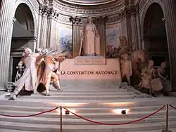 Auf Anregung des Départements Paris und Beschluss der Nationalversammlung vom 3. April 1791 wurde der imposante Kuppelbau zur nationalen Ruhmeshalle erklärt und damit profaniert. Auf dem Giebel wurde die Inschrift angebracht: « Aux grands hommes la patrie reconnaissante » – „Den großen Männern die dankbare Heimat“.[3] Hier sollten wichtige Persönlichkeiten der französischen Geschichte verewigt werden. Dies sollte mittels Denkmälern geschehen, doch war auch vorgesehen, die sterblichen Überreste bedeutender Franzosen in Ehrengräbern im Untergeschoss des Gebäudes zu bestatten. Unter dem gesamten Boden des ehemaligen Gotteshauses befindet sich keine Krypta im üblichen Sinne, sondern ein riesiges Gangsystem mit zahlreichen Kapellen, in denen jeweils bestimmte historische Personen gewürdigt werden, so ähnlich, wie man in den christlichen Kirchen die Heiligen verehrte.