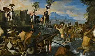 Ein Fugger-Auftrag, an dem er zwischen 1580 und 1592 arbeitete, war eine Serie von zwölf Werken, die die vier Weltzeitalter der Menschen darstellten. Von dieser Serie haben sich zahlreiche Varianten erhalten.[1] Die Ikonographie dieser Serie wurde abgeleitet von Ovids Metamorphosen (I:89-150), die davon erzählt, wie das irdische Paradies des Goldenen Zeitalters über das Silberne und Bronzene Zeitalter in den Streit und die Gier des kriegerischen Eisernen Zeitalters hinabsteigt.[1]