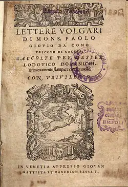 - Lettere volgari di Mons. Paolo Giovio, Venetia, Giovan Battista & Marchion Sessa, 1560 (Digitalisat): Giovios Korrespondenz, hrsg. von Lodovico Domenichi.