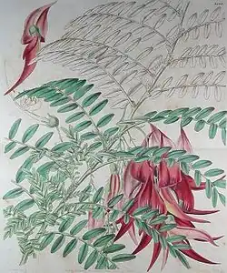 - ↑ a b Gordon Cheers (Hrsg.): Botanica: Das ABC der Pflanzen. 10.000 Arten in Text und Bild. Könemann Verlagsgesellschaft, 2003, ISBN 3-8331-1600-5. Clianthus puniceus auf S. 240.