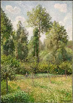 Neu an Pissarros Landschaftsdarstellungen aus den 1890er Jahren war die Betonung einer ländlichen Idylle, die ohne die früher von ihm verwendeten Elemente der industriellen Zeit wie Fabrikschornsteine oder moderne Brücken auskam. Die Pappeln hinter seinem Garten malte er mehrmals zu verschiedenen Jahres- und Tageszeiten sowie bei unterschiedlichen Wetterbedingungen und dem damit verbundenen Lichteinfall. Pissarros Beschäftigung mit dieser ländlichen Idylle lag in jener Zeit der populäre, anarchistisch beeinflusste Glaube an ein ländliches Ideal zugrunde. Ein Bild aus der Serie, das die Pappeln im Lichte des Sonnenuntergangs zeigt, fand große Anerkennung durch Claude Monet, der 1891 selbst begann, eine solche Bilderserie zu malen, die aber im Gegensatz zu Pissarros natürlicher und ungekünstelter Darstellung eher formal und dekorativ wirkt.[2]