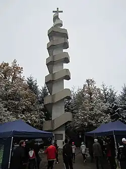 Auf dem Kreuz befindet sich als Inschrift eine abgewandelte Fassung einer Stelle aus dem Matthäusevangelium in Altgriechischer Sprache: ῾ΗΚΡΙΣΙΣΚΑΙΤΟΕΛΕΟΣ ΚΑΙ῾ΗΠΙΣΤΙΣ, was als ῾Η ΚΡΙΣΙΣ ΚΑΙ ΤΟ ΕΛΕΟΣ ΚΑΙ ῾Η ΠΙΣΤΙΣ (he krisis kai to eleos kai he pistis) zu lesen ist und übersetzt „Gerechtigkeit und Barmherzigkeit und Vertrauen“ bedeutet. Die auf einer Tafel am Sockel der Warte angegebene Übersetzung „Von höchstem Gericht. Gottes Erbarmen und Glaube der Armen!“ ist nicht nachvollziehbar.