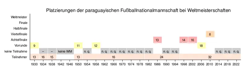 Paraguay nahm an acht Weltmeisterschaftsendrunden teil. Mehrmals schied man in der Qualifikation aus, darunter einmal gegen den späteren Weltmeister. Seitdem die Südamerika-Qualifikation ab dem Ende der 1990er-Jahre im Liga-System zwischen allen südamerikanischen CONMEBOL-Mitgliedern ausgetragen wird, konnte sich Paraguay viermal in Folge qualifizieren, ab 2014 jedoch nicht mehr. Das beste Abschneiden Paraguays war das Erreichen des Viertelfinales 2010; drei weitere Male qualifizierte man sich für das Achtelfinale. Dabei verlor Paraguay dreimal in der K.-o.-Runde mit 0:1, darunter zweimal gegen die späteren Weltmeister Frankreich und Spanien sowie 2002 gegen den späteren Vizeweltmeister Deutschland. 2010 konnte sich Paraguay unter anderem gegen den amtierenden Weltmeister Italien in der Gruppenphase durchsetzen. In der ewigen Rangliste belegt Paraguay als fünftbeste südamerikanische Mannschaft den 24. Platz.