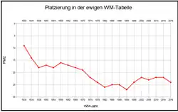 | 27 WM-Spiele 7 Siege 10[1] Unentschieden 10 Niederlagen 30:38 Tore | |