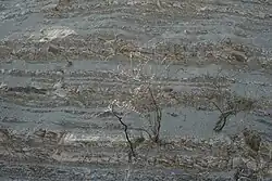 Nach dem eingestellten Zementwerk Saceba folgen auf den Maiolica-Kalk die jüngeren Schichten der Scaglia aus der mittleren Kreidezeit (vor etwa 120 bis 95 Mio. Jahren).[5]:193 Zu sehen sind Mergel und Mergelkalk.[9] Mergel setzt sich aus Kalk und Ton im Verhältnis eins zu zwei zusammen, wohingegen der Mergelkalk das umgekehrte Verhältnis aufweist, zwei Anteile Kalk pro Anteil Ton.[6]:55