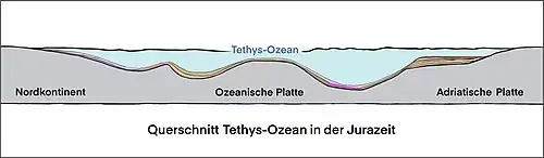 Später, in der Erdneuzeit, entstanden die Alpen. Damals trafen der Kleinkontinent Adria und der Nordkontinent zusammen.[5]:11 Die ozeanische Platte dazwischen verschwand grösstenteils unter der Erdkruste, und die Ablagerungen auf dem Meeresboden – die Sedimentschichten – wurden in der Kontaktzone zusammengedrückt, aufgestellt und über den Nordkontinent geschoben.[4][6]:82