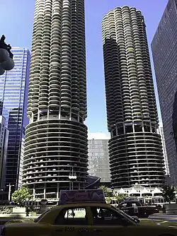 Eine andere Möglichkeit, um Parkdecks zu erschließen, ist die Nutzung von Aufzügen. Insbesondere frühe Parkhäuser nutzten diese Technik häufig, da unter anderem befürchtet wurde, dass die Fahrzeuge nicht in jedem Fall ausreichend motorisiert waren, um den Höhenunterschied über eine Rampe zu bewältigen.[3] Nachteile liegen in hohen Installations- und Betriebskosten und in einem limitierten Fahrzeug-Durchsatz.