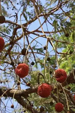 Dementsprechend hängen auch die bis zu 20–40 Zentimeter langen, 1,5–2,5 Zentimeter breiten, vielsamigen, glatten und kahlen, flachen, braunen Hülsenfrüchte zu mehreren an den Köpfchen. Die Samen mit Pleurogram sind glatt, hart und glänzend, dunkelbraun, sowie etwa 1–1,5 Zentimeter groß.