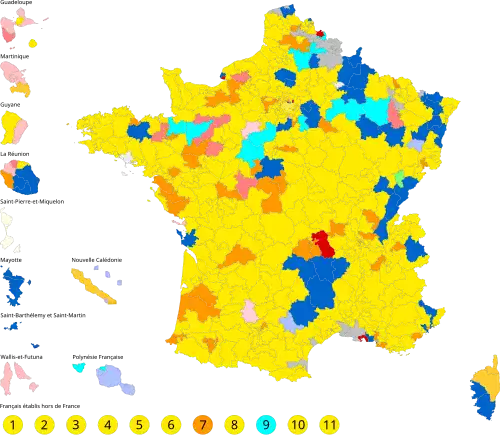 In allen übrigen 573 Wahlkreisen wurde ein zweiter Wahlgang notwendig. Im 2. Wahlkreis des Départements Aveyron trat nur die Kandidatin von LREM, Anne Blanc, an, die im ersten Wahlgang 38,8 % der Stimmen bekam, da der Gegenkandidat für den zweiten Wahlgang, André At von Les Républicains (20,2 % im ersten Wahlgang), verzichtet hatte.[14] Aufgrund der geringen Wahlbeteiligung konnten sich nur in einem einzigen Wahlkreis drei Kandidaten für den zweiten Wahlgang qualifizieren: Im ersten Wahlkreis im Département Aube standen sich Kandidaten von LREM (29,9 % im ersten Wahlgang), Les Républicains (25,7 %) und des Front national (24,9 %) gegenüber. In allen anderen 571 Wahlkreisen kam es zu einem Duell.