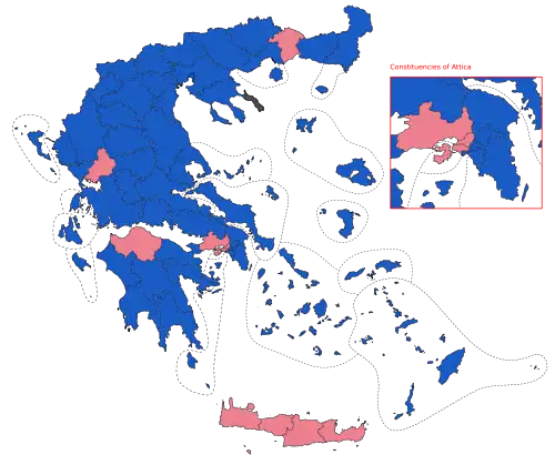 | Nea Dimokratia (ND) Νέα Δημοκρατία (Ν.Δ.) | 2.407.750 | 40,8 | 146 | –12 | |