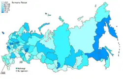 | Oblast Magadan | 50,6 % | 41,0 % | 22,8 % | 11,6 % | 17,4 % | 3,5 % | 1,9 % | 0,8 % | 1,3 % |