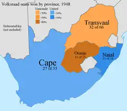 Obwohl die HNP mit 37,7 Prozent der Wählerstimmen deutlich hinter der bislang regierenden UP lag, gewann sie 70 Sitze und wurde damit die stärkste Fraktion des neuen Parlaments. Die HNP und AP lagen vor allem in ländlichen Wahlkreisen vorne, während die UP und LP in urbanen Wahlkreisen die Mehrheit hatten. Premierminister Smuts verlor seinen Sitz im Wahlkreis Standerton. Nach der Wahl bildeten HNP und AP die neue Regierung und vereinigten insgesamt eine Mehrheit von 79 der 153 Sitze auf ihre Fraktionen.