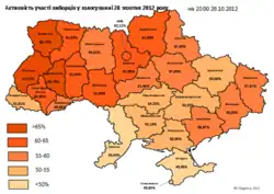 Die Wahlen zum Ukrainischen Parlament 2012 fanden am 28. Oktober 2012 statt. Eine vorgezogene Neuwahl zur Werchowna Rada war bereits für Dezember 2008 vorgesehen, wurde aber auf 2009 verschoben. Angesichts der internationalen Finanzkrise, welche die Ukraine hart getroffen hatte und eine entscheidungsfähige Staatsführung erforderte, sowie aufgrund der schwankenden Umfragewerte für die im Parlament vertretenen Parteien, kamen die vorgezogenen Wahlen letztlich auch zu diesem Termin nicht zustande.[1][2] Sie fand schließlich nach Ablauf der regulären vierjährigen Legislaturperiode statt.[3][4]