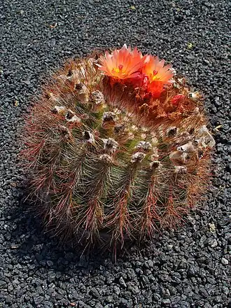 Die glockenförmigen, gelegentlich sogar urnenförmigen, Blüten erreichen Längen von 4 bis 5 Zentimeter und Durchmesser von 4,5 bis 7 Zentimeter. Ihr Perikarpell und die Blütenröhre sind mit Schuppen, weißer Wolle und rötlich braunen Borsten besetzt. Die Narben sind rot. Die mit gelblich grauer Wolle und rötlich braunen Borsten besetzen Früchte sind 2,5 bis 2,7 Zentimeter lang und enthalten helmförmige, glänzend schwarze Samen.