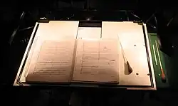 Eine Partitur (italienisch partitura ‚Einteilung‘; französisch partition (d’orchestre); englisch score) ist eine Aufzeichnung mehrstimmiger Musik in Notenschrift, bei der die einzelnen Stimmen übereinander angeordnet und mit senkrecht durchlaufenden Taktstrichen verbunden sind. In der Partitur sind somit alle Instrumental- und Vokalstimmen einer Komposition oder Bearbeitung erfasst.[1] Dadurch können der Verlauf der Einzelstimmen, ihre Koordination und die Zusammenklänge abgelesen werden – insbesondere kann der Dirigent das musikalische Geschehen auf einen Blick überschauen. Die Partitur enthält auch Hinweise zur Aufführung wie Tempo, Dynamik und Spielanweisungen. Sie entsteht bei der Niederschrift der Komposition oder eines Arrangements und dient der Aufführung und dem Studium. Heute hat die Partitur zentrale Bedeutung für das Komponieren, Überliefern und Aufführen mehrstimmiger Musik. In der Zeit vor 1600 waren noch andere Aufzeichnungsweisen vorherrschend und auch danach war die Partitur für Aufführungen bis um 1800 allgemein noch nicht gebräuchlich.[2]