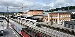 Der Hauptbahnhof Passau wurde im Jahre 1860 durch die Actiengesellschaft der bayerischen Ostbahnen errichtet. Er lag damals noch auf dem Gebiet der Gemeinde St. Nikola, die erst 1870 zu Passau kam. Er besitzt sechs Bahnsteiggleise, davon ein Stumpfgleis, und drei Durchgangsgleise. Das ca. 130 m lange Gebäude ist im klassizistischen Stil gebaut. Im Schnitt nutzen ca. 6.500 Fahrgäste pro Tag diesen Bahnhof.[1] Täglich fahren im Schnitt 77 Züge den Bahnhof an. Insgesamt 90 Mitarbeiter beschäftigte die DB AG 2010 am Bahnhof.[2]