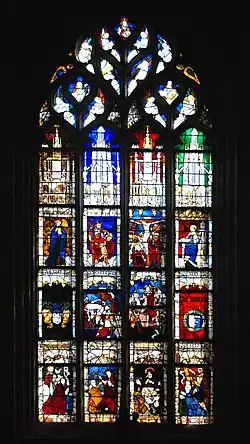 Das Fenster wurde von einer unbekannten Werkstatt geschaffen. Es zeigt verschiedene Szenen aus dem Leben und dem Leidensweg Jesu. Daneben werden Heilige dargestellt.