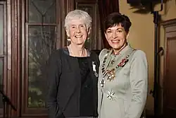 Pat Langhorne (links), nachdem sie am 27. September 2019 von der Generalgouverneurin Dame Patsy Reddy im Larnach Castle auf der Otago-Halbinsel mit der New Zealand Antarctic Medal für Verdienste um die Antarktiswissenschaft ausgezeichnet wurde