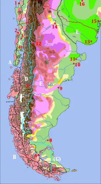 7 = Ushuaia, 8 = Río Gallegos, 9 = Comodoro Rivadavia, 10 = Trelew, 11 = Puerto Madryn, 12 = Bariloche, 13 = Viedma, 14 = Neuquén, 15 = Bahía Blanca, 16 = Santa Rosa de Toay