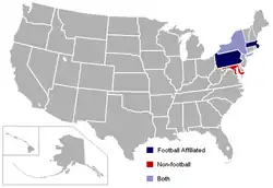 1 Fordham war von 1990 bis 1995 Vollmitglied der Konferenz und verlegte danach alle Sportarten außer Football in die Atlantic 10 Conference.