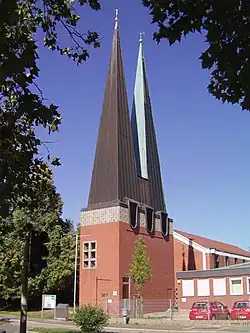 Das evangelisch-lutherische Gemeindezentrum wurde zwischen 1960 und 1961 errichtet. Von der Straße zurückgesetzt befindet sich die giebelständige Pfarrkirche. Ein Sichtziegelbau mit Betonbindern und einem Satteldach. Traufseitig besitzt der Saalbau spatenförmige Fenster und eine Chorwand mit zwölfteiliger, farbverglaster Befensterung. Der freistehende Kirchturm ist in Sichtziegelbauweise erbaut. Betonierte Klangöffnungen und zwei kupfergedeckte Spitzhelme charakterisieren den Glockenturm. Gemeindehaus und Pfarrhaus sind eingeschossig in Sichtziegelmauerwerk erstellt und ordnen sich um einen Innenhof an. Der offene Laubengang verbindet Kirchturm, Pfarrhaus und Pfarrkirche.