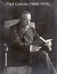 Paul Dubois habilitierte sich 1876 an der Medizinischen Fakultät in Bern für «Physikalische Diagnostik» und hielt dort Vorlesungen über Elektrodiagnostik und Elektrotherapie, später über Psychotherapie. Die Bezeichnung „Psychotherapie“ führte er 1903 ein.[6] Er wurde 1902 ad personam zum ausserordentlichen Professor für «Neuropathologie» in Bern ernannt. Vom 1. bis 6. September 1902 fand der Zweite Internationale Kongress für medizinische Elektrologie und Radiologie in Bern unter dem Präsidium von Paul Dubois statt.[2] In psychiatrischer Hinsicht entwickelte Dubois etwa gleichzeitig mit Sigmund Freud (1856–1939) und Pierre Janet (1859–1947) seine eigenständige Theorie über die Psychogenie vieler seelischer Störungen und erfasste die Bedeutung der Biographie. Zunächst arbeitete er mit Suggestivmethoden, die er von Hippolyte Bernheim (1840–1919) übernommen hatte, insbesondere auch mit dem Elektrisieren.[3][5] Letztere Methode war u. a. auch von George Miller Beard praktiziert worden. Dubois’ Theorien zielten im Gegensatz zu Freud eher auf psychosomatische Tatbestände. Dubois leitete seine Behandlungen mit Bettruhe ein, möglichst in einem komfortablen Krankenhaus.[3] Dieser eher kurmässige Behandlungstil, der auch Diätvorschriften enthielt, erinnert ebenfalls an die Methoden der Behandlung bei Neurasthenie. Dieser Stil mag dazu beigetragen haben, dass sich unter seinen Patienten viele prominente Künstler und Politiker befanden.[3] Auch der von Freud psychotherapierte Wolfsmann, Sergej Pankejeff, den Freud später an Ruth Brunswick überwies, hatte ursprünglich die Absicht, sich bei Dubois behandeln zu lassen. Dubois hat seinen Patienten nachweislich viel geholfen, fand jedoch keinen direkten Nachfolger. Somit entstand keine Tradition. Seine Psychotherapie wurde vorübergehend von praktischen Ärzten aufgegriffen, die damit nur wenige Voraussetzungen ausser dem gesunden Menschenverstand erfüllen mussten. Um 1910 war Dubois dennoch neben Freud der meistgesuchte Psychotherapeut in Europa.[3][5]
