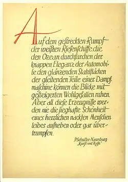 Schultze-Naumburg betrachtete sich als Vorkämpfer gegen den „Kulturbolschewismus“.[5] 1928 erschien im J.F. Lehmanns Verlag München sein Buch Kunst und Rasse.) Im 1. Kapitel "Der Mensch und seine Rasse", zeigt sich (auf SS.8 und 9 dieser Ausgabe) in der Fußnote (1) die Adaption der Ideologie Hans F. K. Günthers: "Es kann nicht Aufgabe dieses Buches sein, eine Rassenkunde zu bringen. Nur um dem Leser, dem die Materie neu ist, das Buch überhaupt verständlich zu machen, sei kurz angeführt, daß man die deutsche Bevölkerung ım wesentlichen auf fünf Rassenbestandteile zurückführt; die nordische Rasse, die alpine (nach Günther „ostische“) Rasse, die mediterrane (nach Günther die „westische“) Rasse, die dinarische und endlich die ostbaltische. Die rassischen Bestandteile des jüdischen Volkes, von der immerhin ca. 600000 Menschen in Deutschland leben und eine vielleicht noch größere Zahl durch Blutmischung im deutschen Volkskörper aufgegangen ist, weist zumeist außer orientalischem vorderasiatisches Blut auf. Zum rechten Verständnis des vorliegenden Buches wird allerdings die nähere Bekanntschaft mit der Rassenkunde nicht zu entbehren sein. Am besten vermittelt diese das Buch von Dr. Günther: "Die Rassenkunde Europas", 2. Aufl., im Verlag J.F. Lehmann, München."[6]