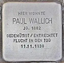 Paul Wallich, der jüdischer Abstammung war, gehörte der Gesellschaft der Freunde an bis zu ihrer zwangsweisen Auflösung 1935. Nach den Novemberpogromen verübte Wallich im Alter von 56 Jahren Suizid.[1] Seine Ehefrau und seine drei Kinder verließen in den 1930er Jahren Deutschland, darunter Henry C. Wallich (1914–1988), der später Professor für Ökonomie an der Universität Yale wurde.