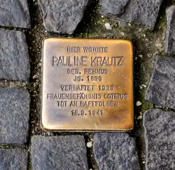 Vor dem ehemaligen Wohn- und Geschäftshaus von Pauline Krautz in der Sandower Straße in Cottbus erinnert heute ein „Stolperstein“ an sie.[1]